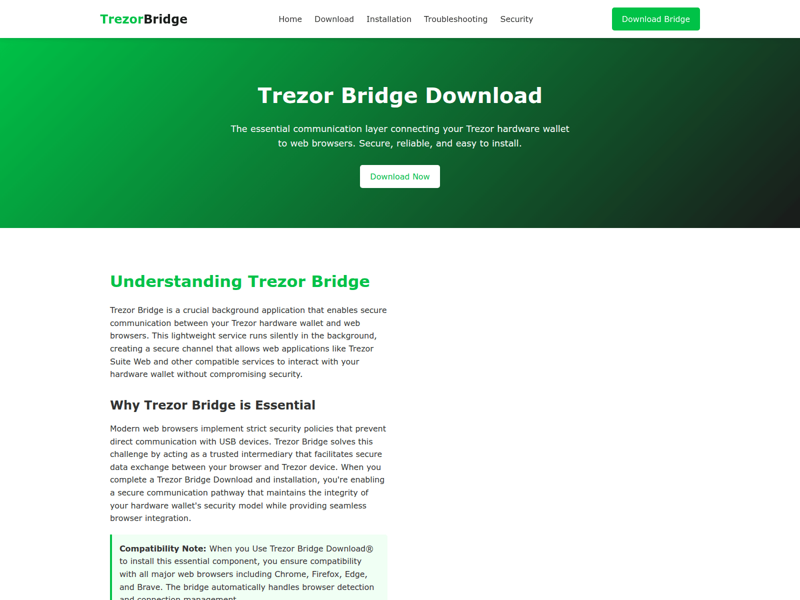 The site displays a page titled “Trezor Bridge Download - Official Communication Tool”.
