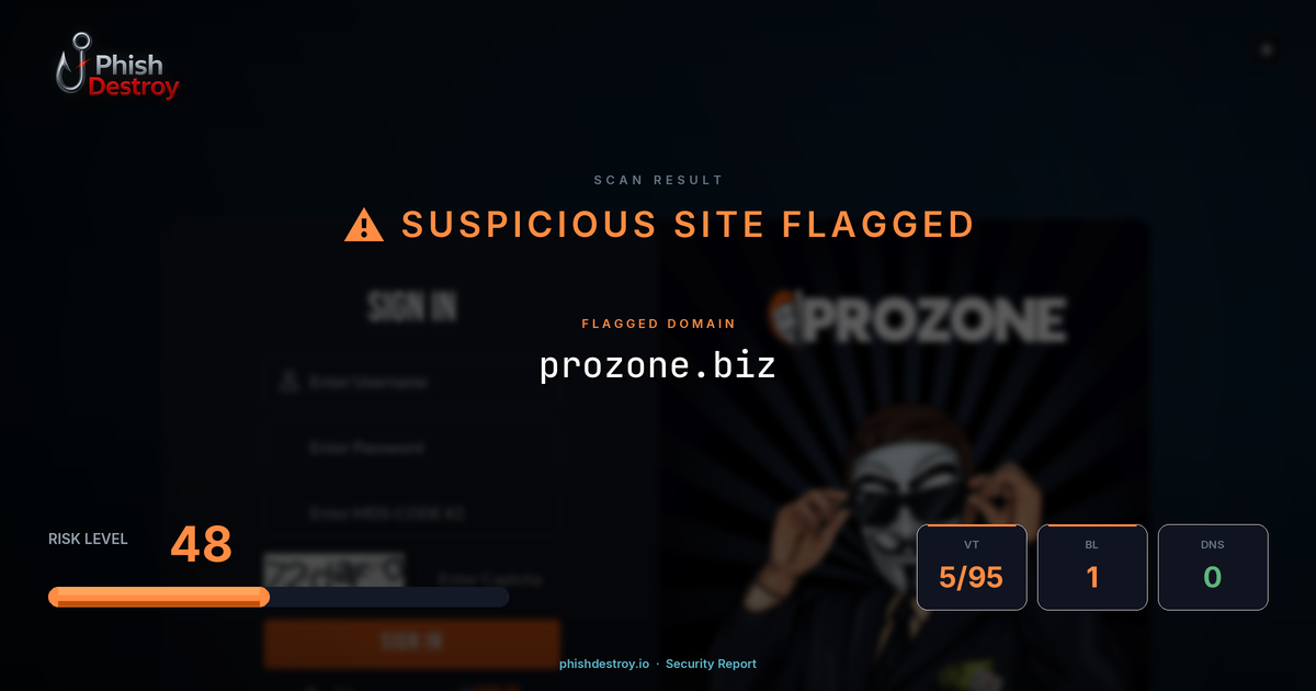 This domain security report for prozone.biz is maintained by PhishDestroy's automated threat intelligence pipeline. Our system continuously monitors this domain across 5 security vendors on VirusTotal, 1 public blocklists.