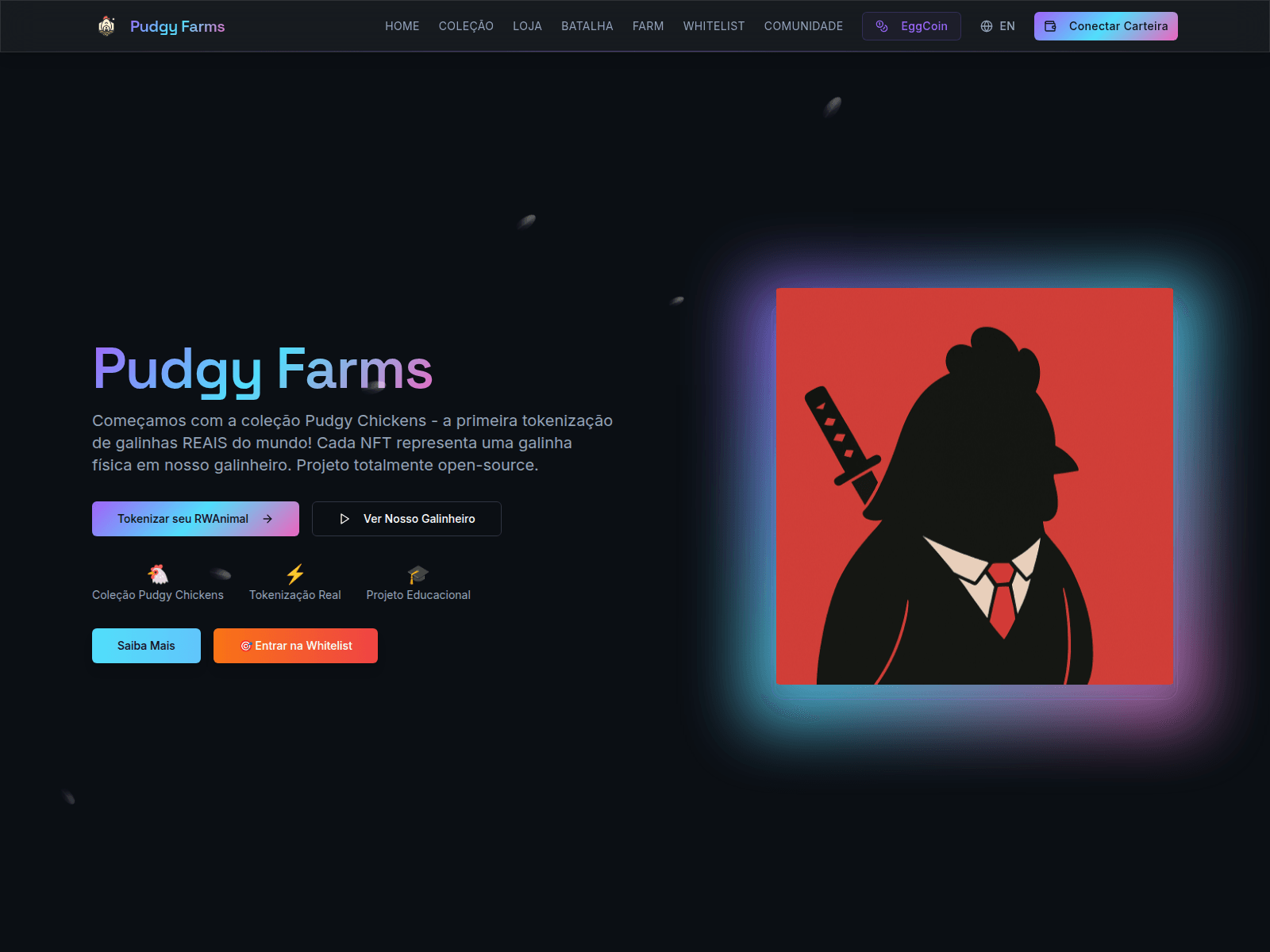 The site displays a page titled “Pudgy Farms - Protocolo de Tokenização de RWAnimals”.