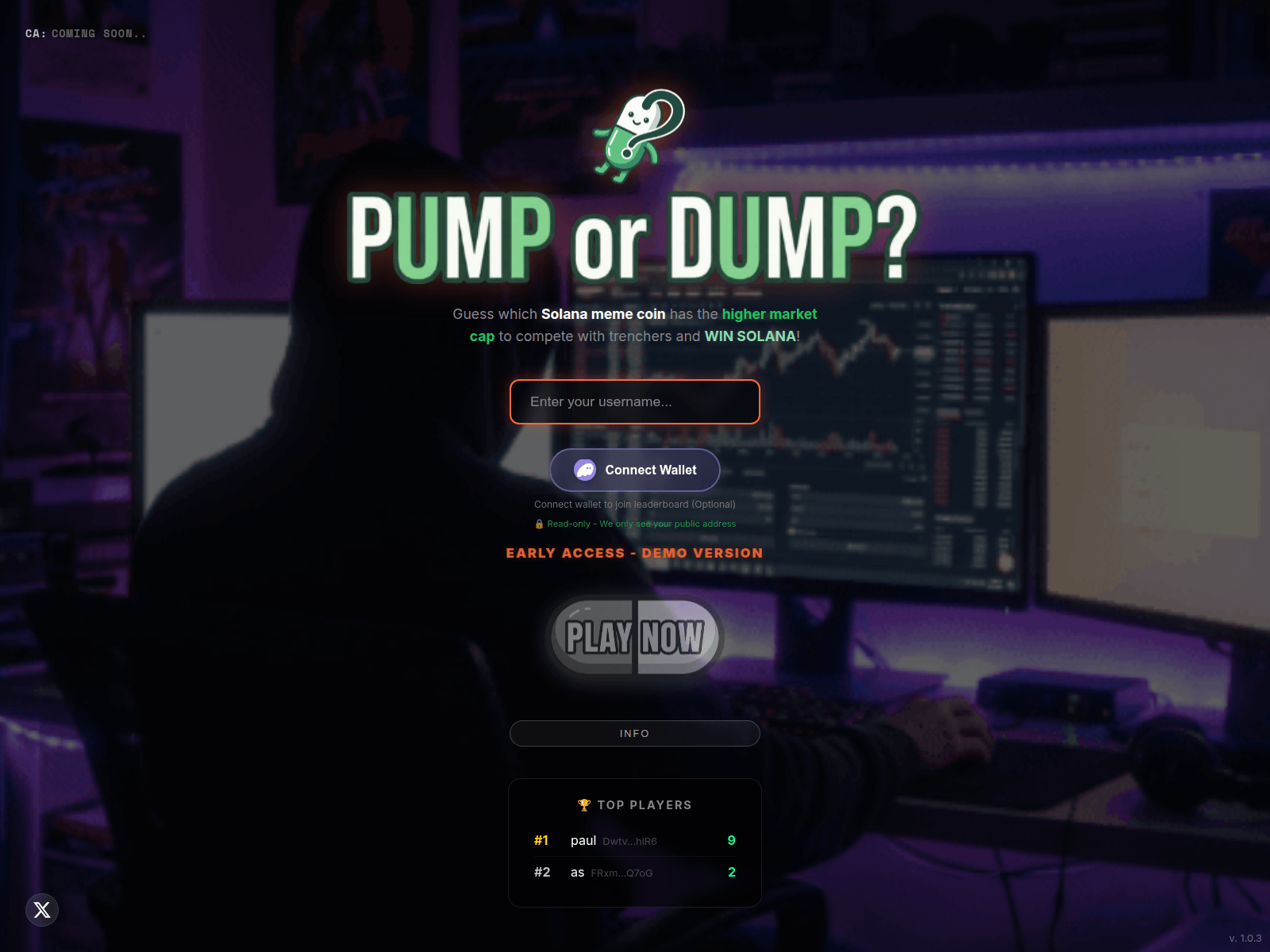 The site displays a page titled “PUMP or DUMP? - PLAY NOW!”.