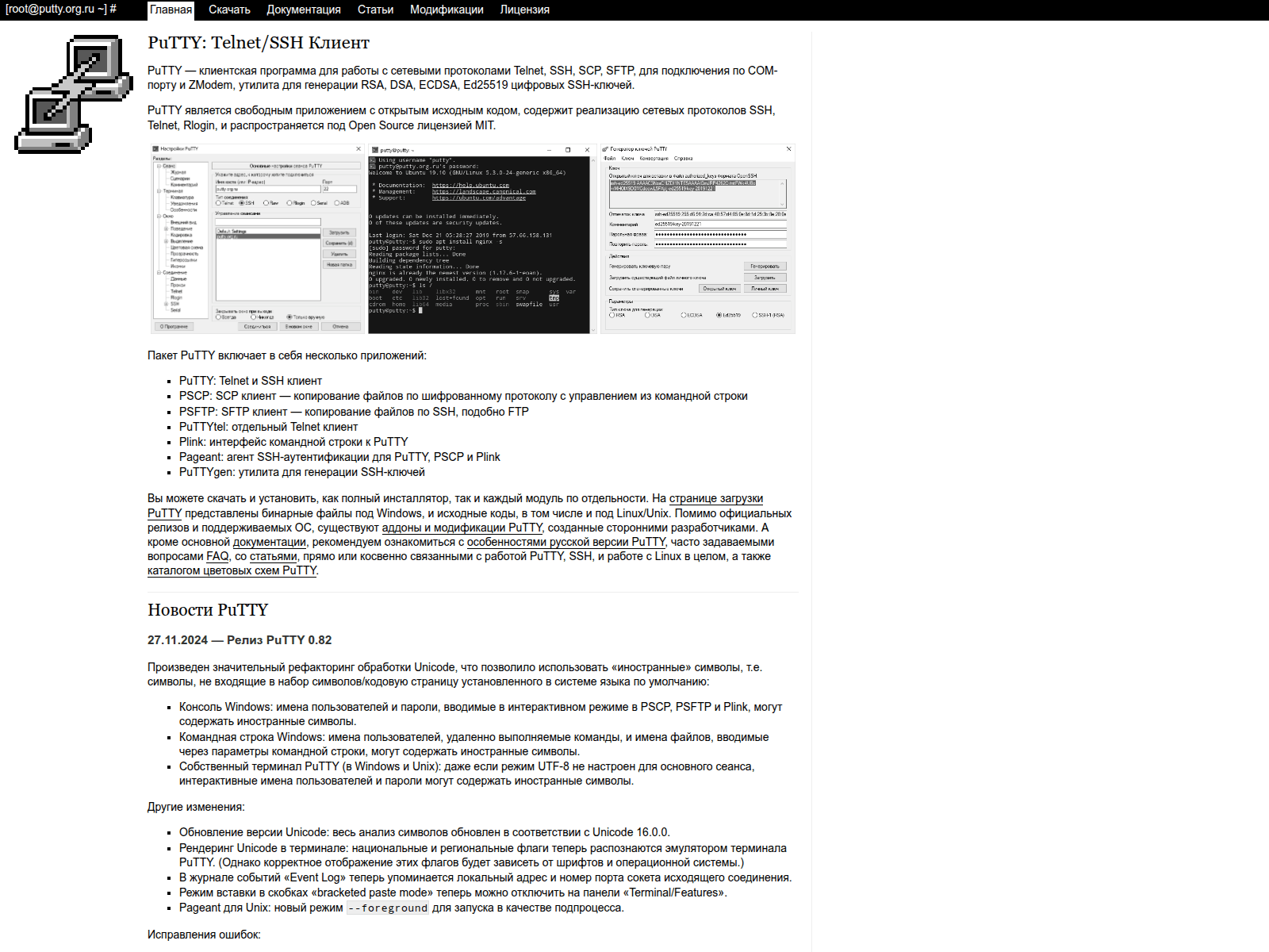 The site displays a page titled “PuTTY: Telnet/SSH Клиент”.