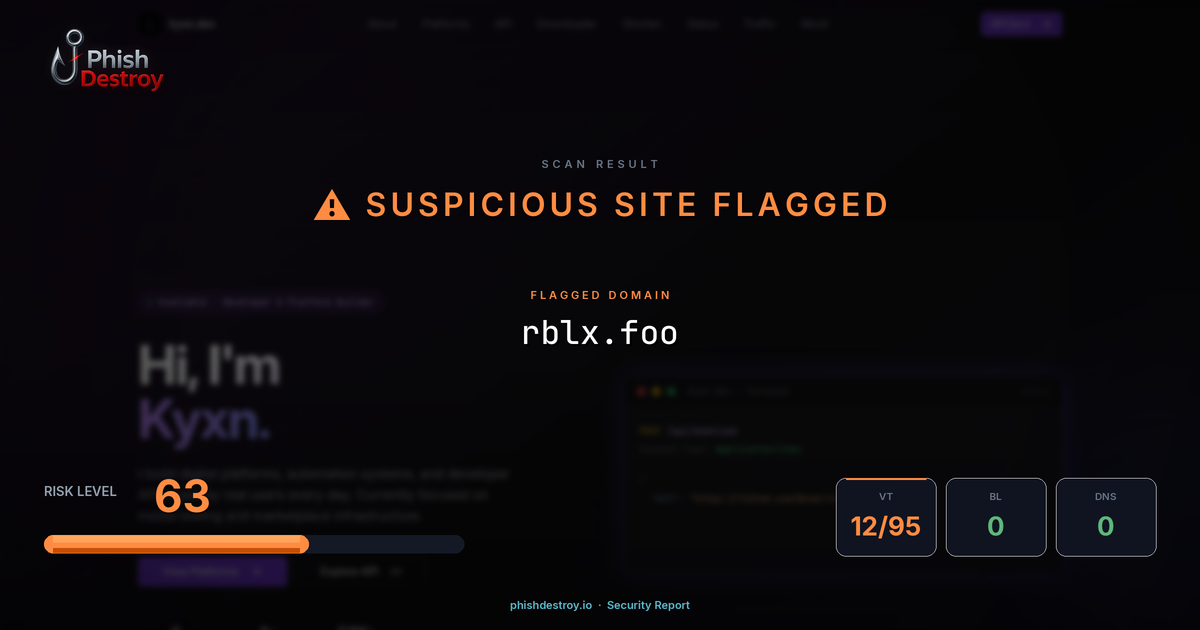 This domain security report for rblx.foo is maintained by PhishDestroy's automated threat intelligence pipeline. Our system continuously monitors this domain across 12 security vendors on VirusTotal, 2 public blocklists.