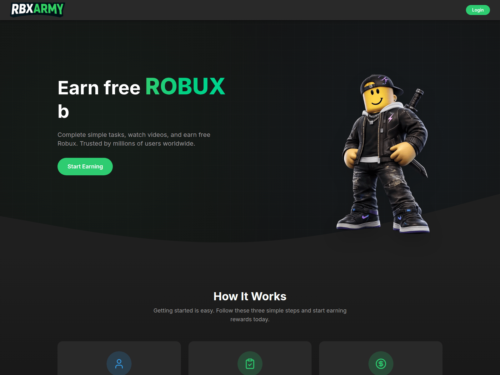 The site displays a page titled “RbxArmy — Earn Free Robux & Rewards”.