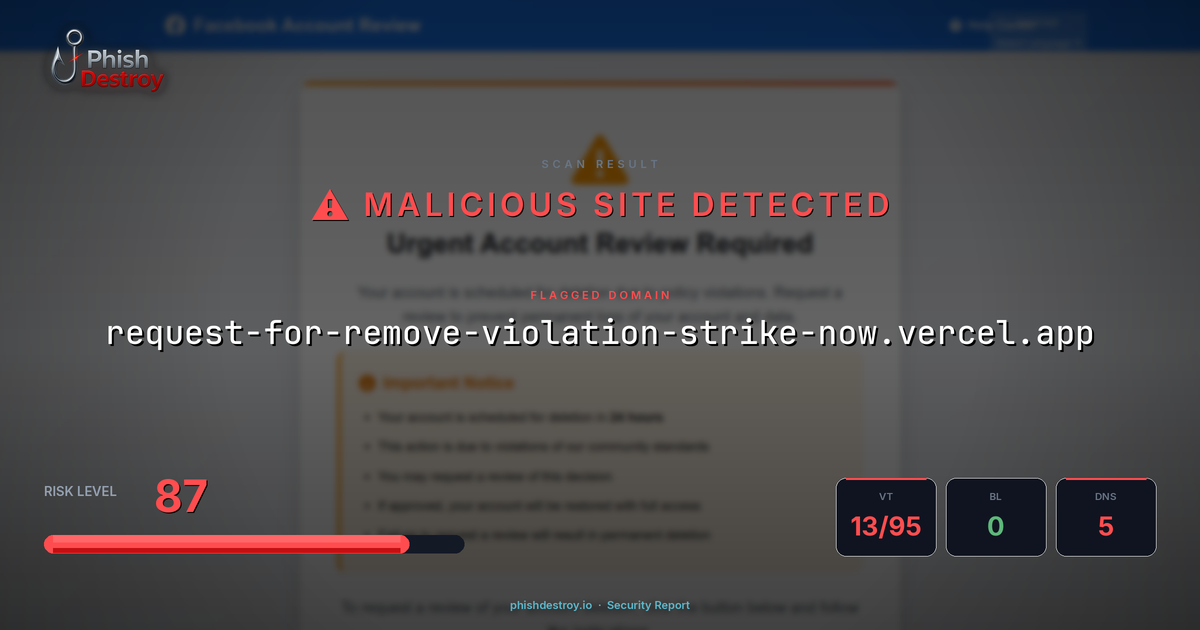 This domain security report for request-for-remove-violation-strike-now.vercel.app is maintained by PhishDestroy's automated threat intelligence pipeline. Our system continuously monitors this domain across 13 security vendors on VirusTotal, 1 public blocklists.