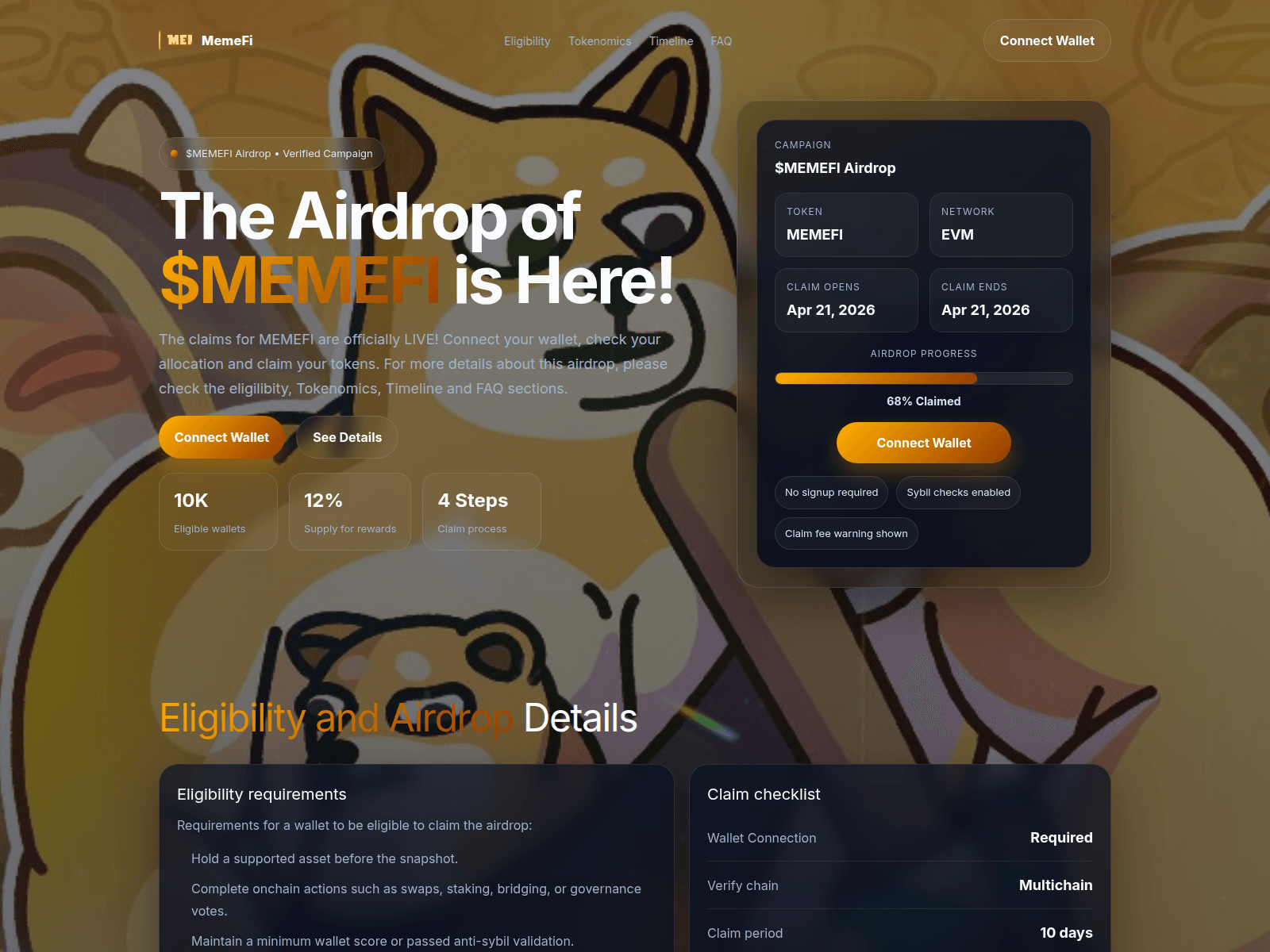The site displays a page titled “$MEMEFI Airdrop”, which may be designed to impersonate Airdrop Scam.
