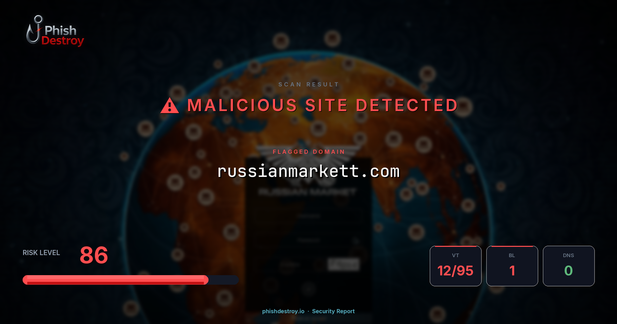 This domain security report for russianmarkett.com is maintained by PhishDestroy's automated threat intelligence pipeline. Our system continuously monitors this domain across 12 security vendors on VirusTotal, 1 public blocklists.