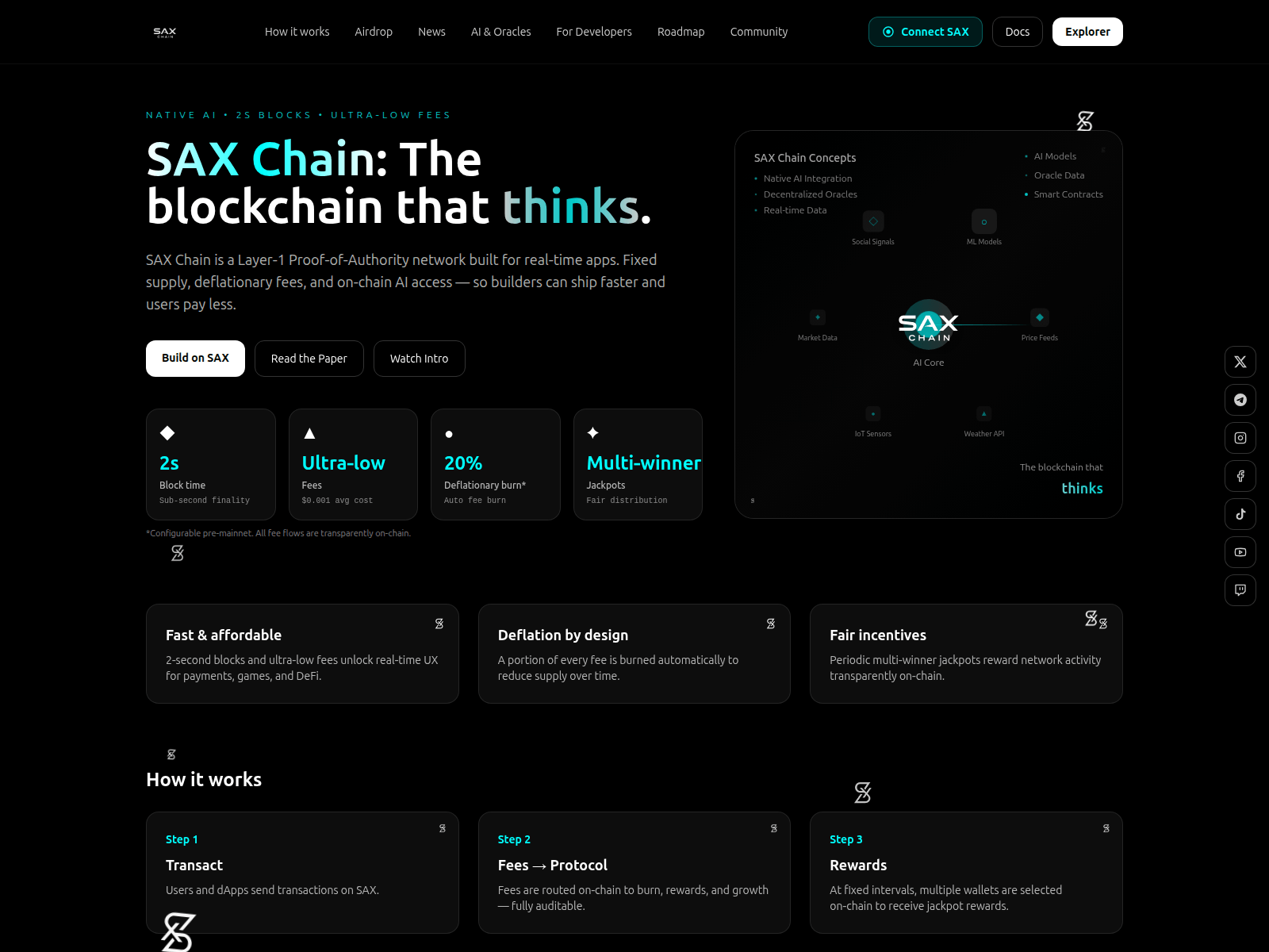The site displays a page titled “SAX Chain - The Blockchain That Thinks”.
