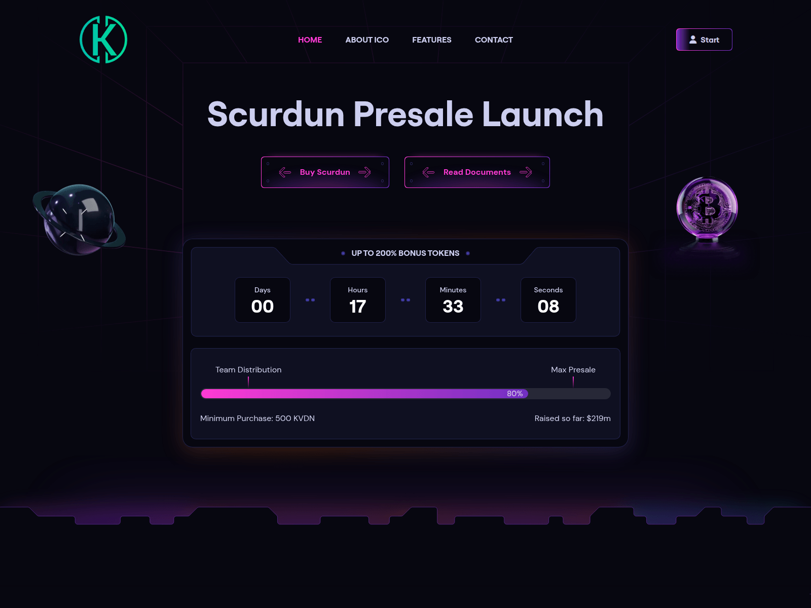 The site displays a page titled “Scurdun Official Presale with up to 200% bonus”.