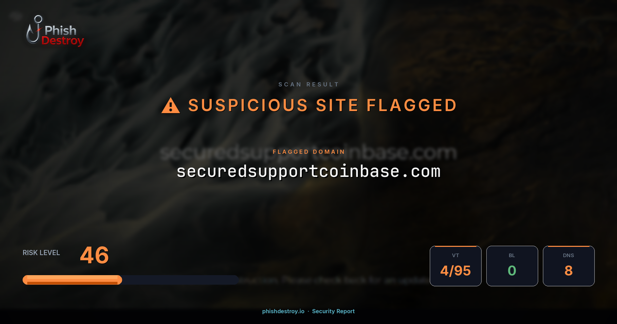 This domain security report for securedsupportcoinbase.com is maintained by PhishDestroy's automated threat intelligence pipeline. Our system continuously monitors this domain across 4 security vendors on VirusTotal, 1 public blocklists.