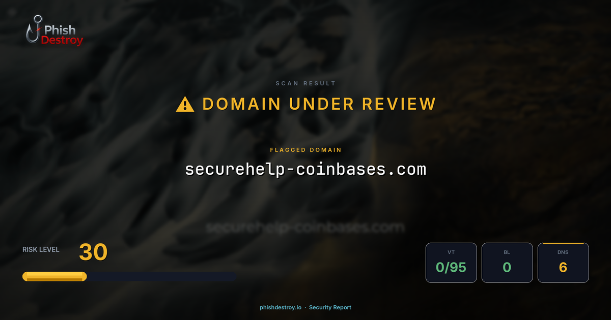 securehelp-coinbases.com has been listed on PhishDestroy as a suspicious domain. Scanned by 95 security vendors — automated detections may take time to update. PhishDestroy threat analysts continue to monitor this domain.