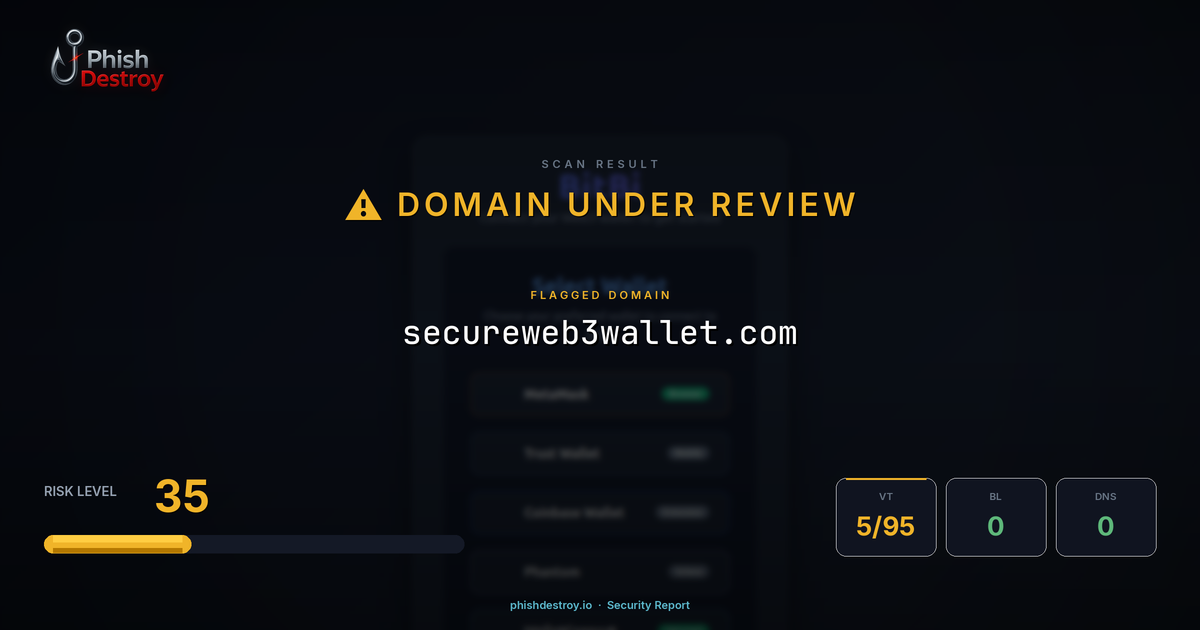 This domain security report for secureweb3wallet.com is maintained by PhishDestroy's automated threat intelligence pipeline. Our system continuously monitors this domain across 5 security vendors on VirusTotal, 1 public blocklists.