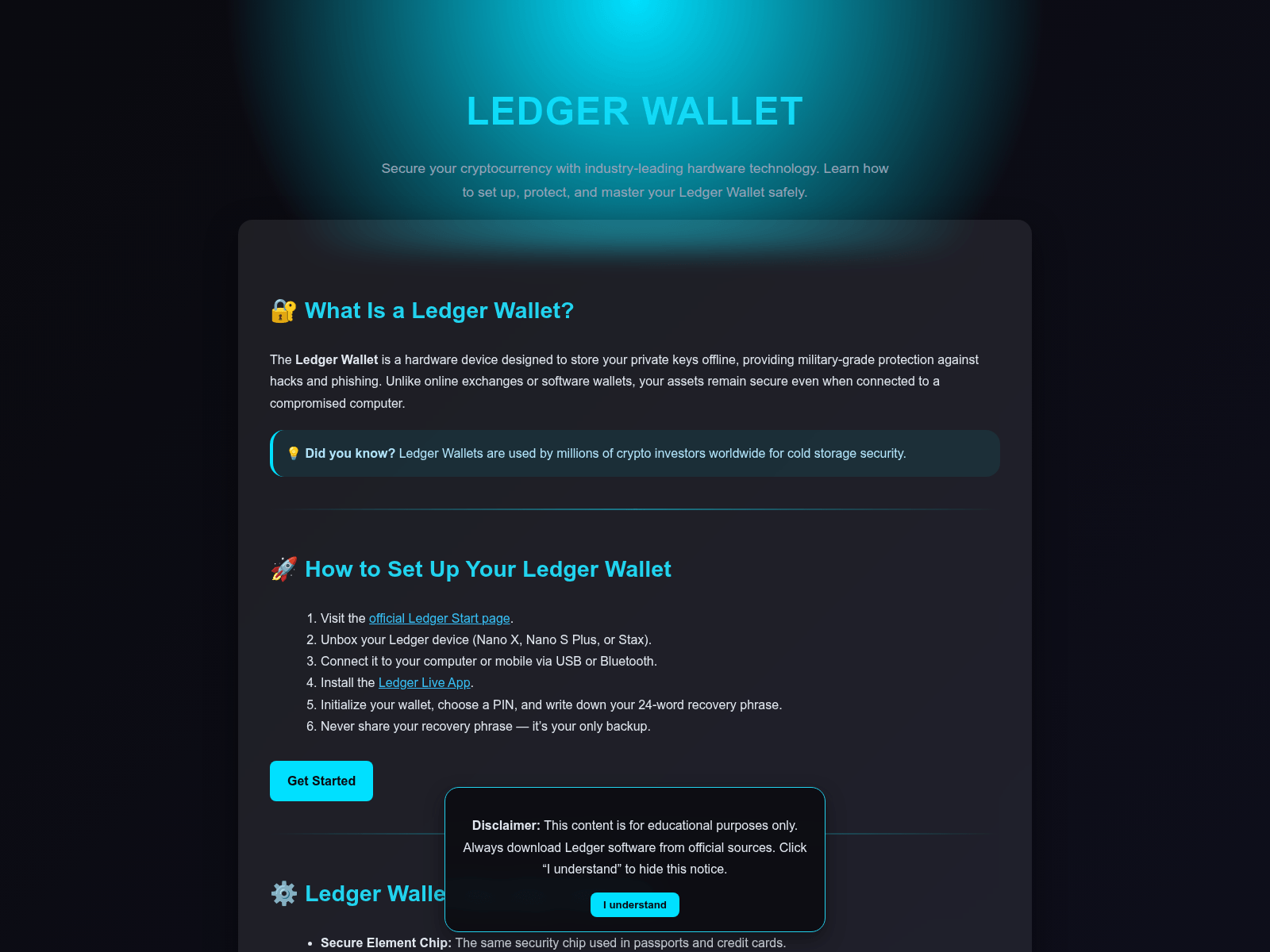 The site displays a page titled “Ledger Wallet — Your Gateway to Safe Crypto Storage”, which may be designed to impersonate Ledger.
