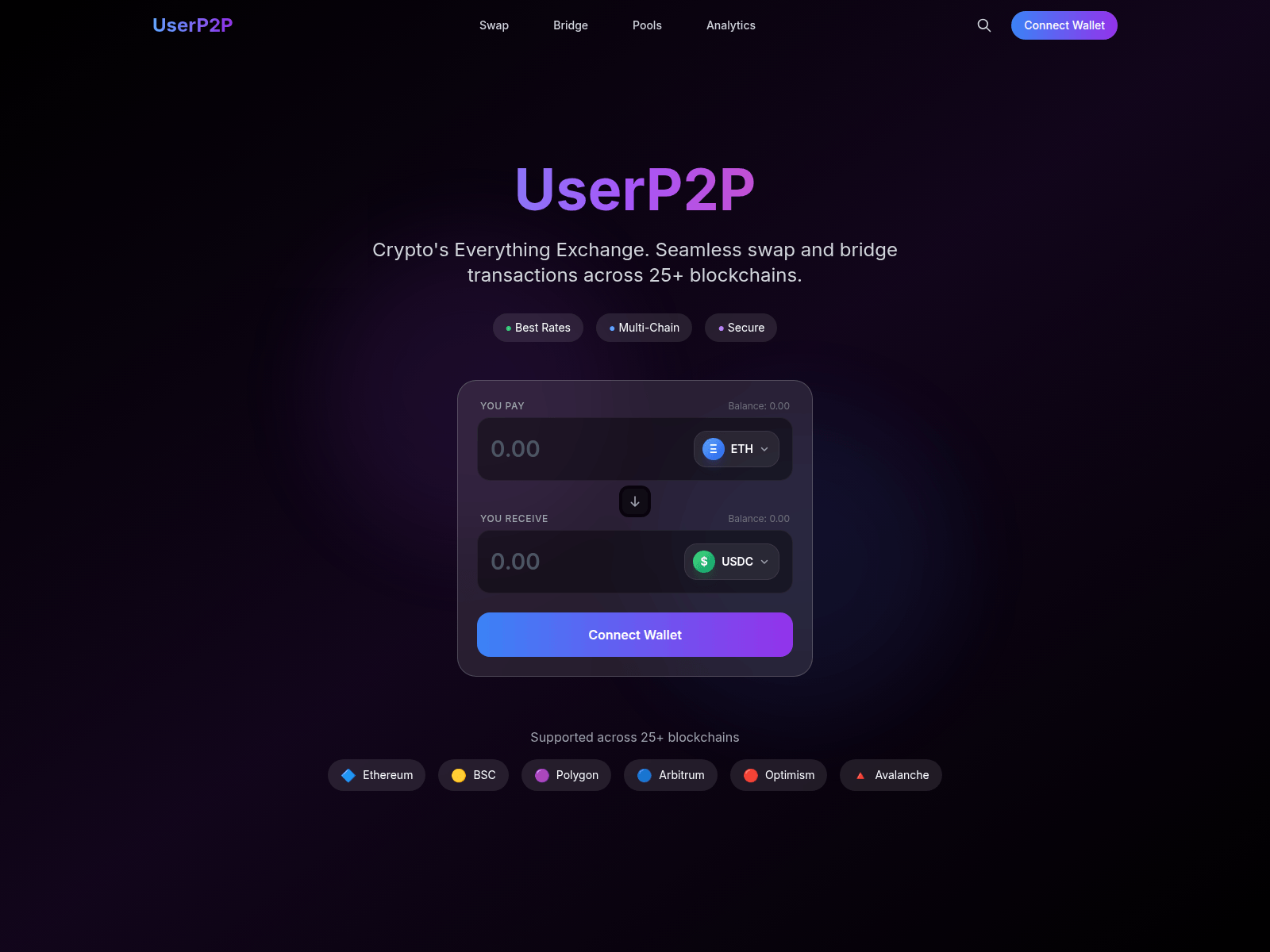 The site displays a page titled “UserP2P | Multi-Chain Bridging & Swapping”.