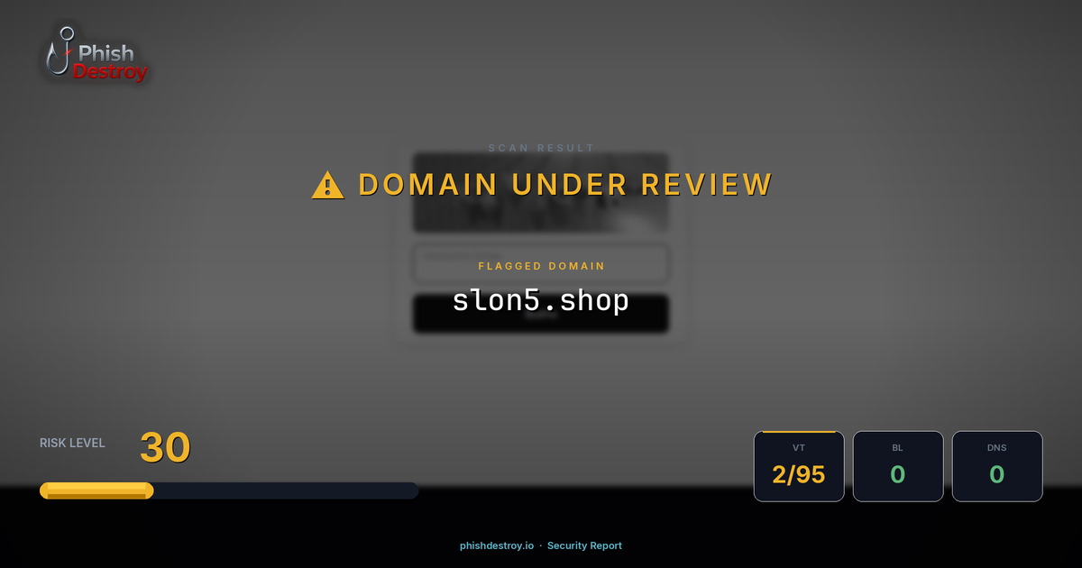 This domain security report for slon5.shop is maintained by PhishDestroy's automated threat intelligence pipeline. Our system continuously monitors this domain across 2 security vendors on VirusTotal, 1 public blocklists.
