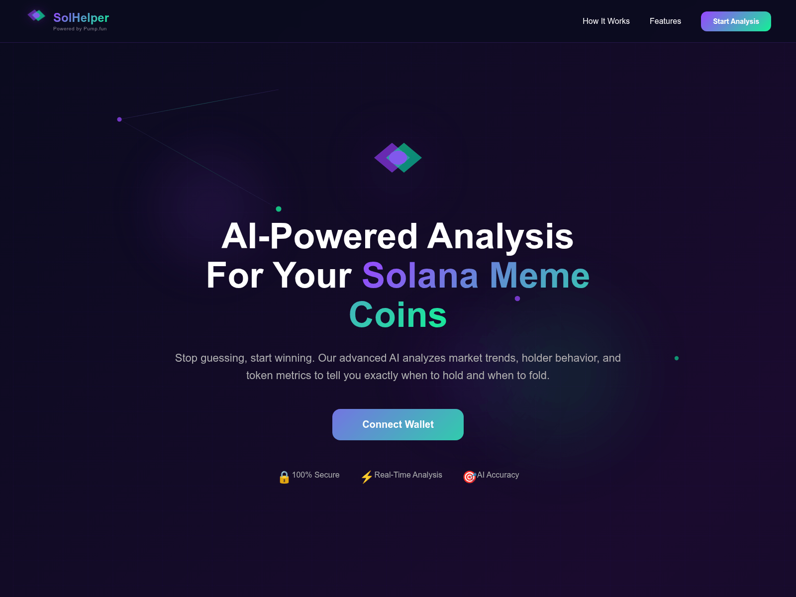 The site displays a page titled “SolHelper - AI Analytics for Solana Meme Coins”, which may be designed to impersonate across.