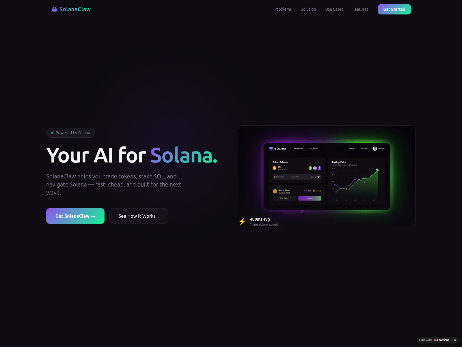 The site displays a page titled “SolanaClaw — Your AI for Solana”, which may be designed to impersonate Solana.