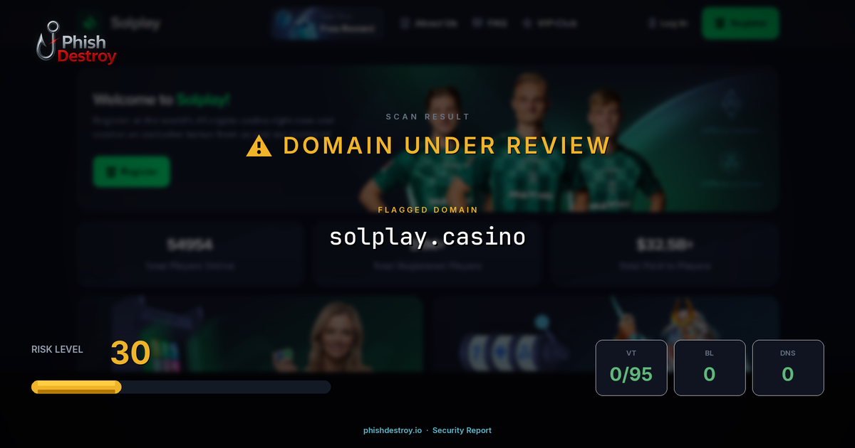 solplay.casino has been listed on PhishDestroy as a suspicious domain. Scanned by 95 security vendors — automated detections may take time to update. PhishDestroy threat analysts continue to monitor this domain.