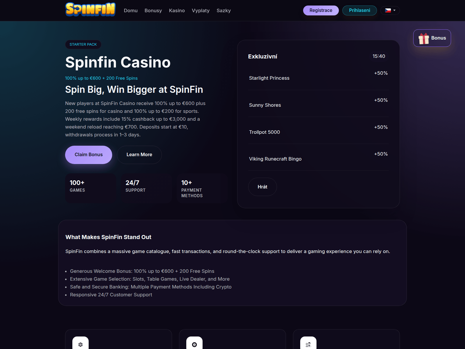 The site displays a page titled “Spinfin Casino » Login & Play at Official UK Site”.