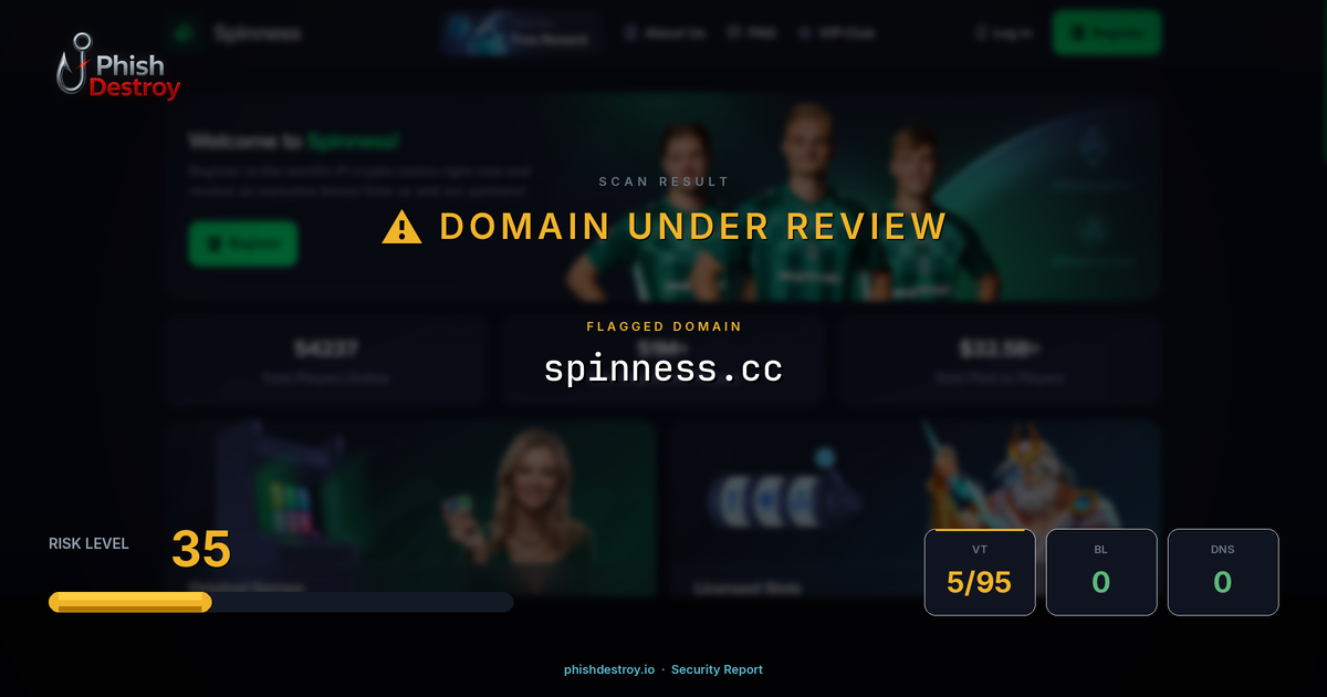 The domain spinness[.]cc has been flagged as a phishing threat. PhishDestroy's automated scanning systems detected multiple risk indicators associated with this domain.