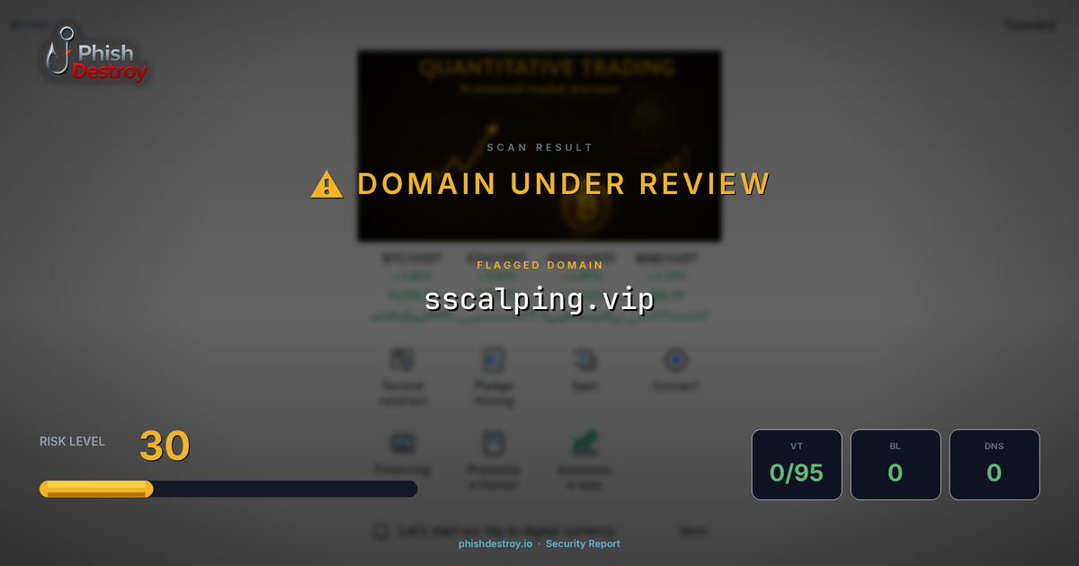 sscalping.vip has been listed on PhishDestroy as a suspicious domain. Scanned by 95 security vendors — automated detections may take time to update. PhishDestroy threat analysts continue to monitor this domain.