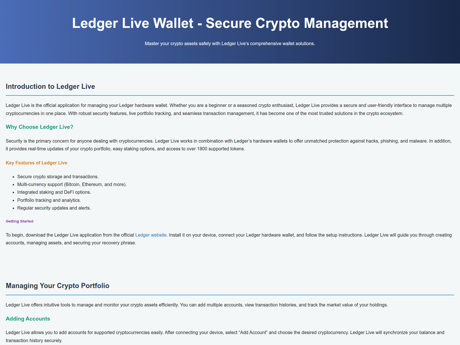 The site displays a page titled “Ledger Live Wallet - Secure Crypto Management”, which may be designed to impersonate Ledger.
