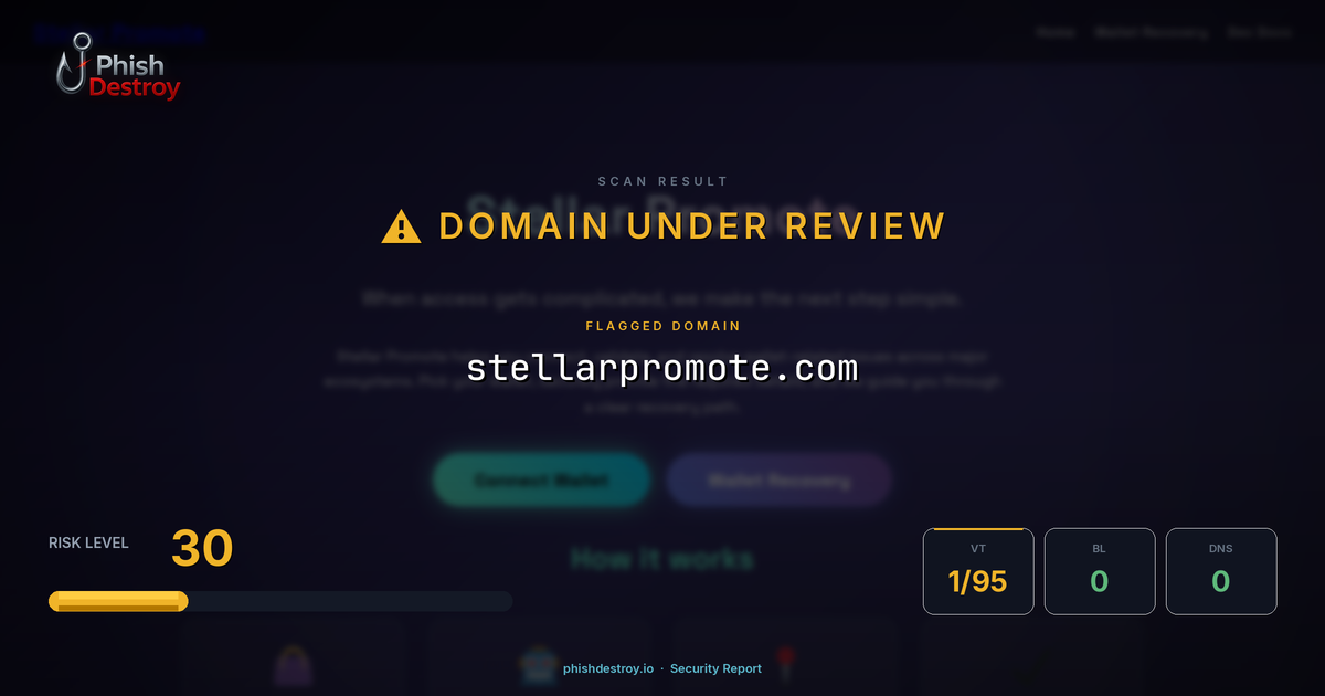 This domain security report for stellarpromote.com is maintained by PhishDestroy's automated threat intelligence pipeline. Our system continuously monitors this domain across 1 security vendors on VirusTotal, 3 public blocklists.