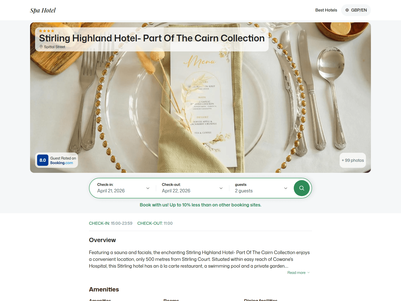 The site displays a page titled “Stirling Highland Hotel- Part Of The Cairn Collection - Stirling, United Kingdom”.