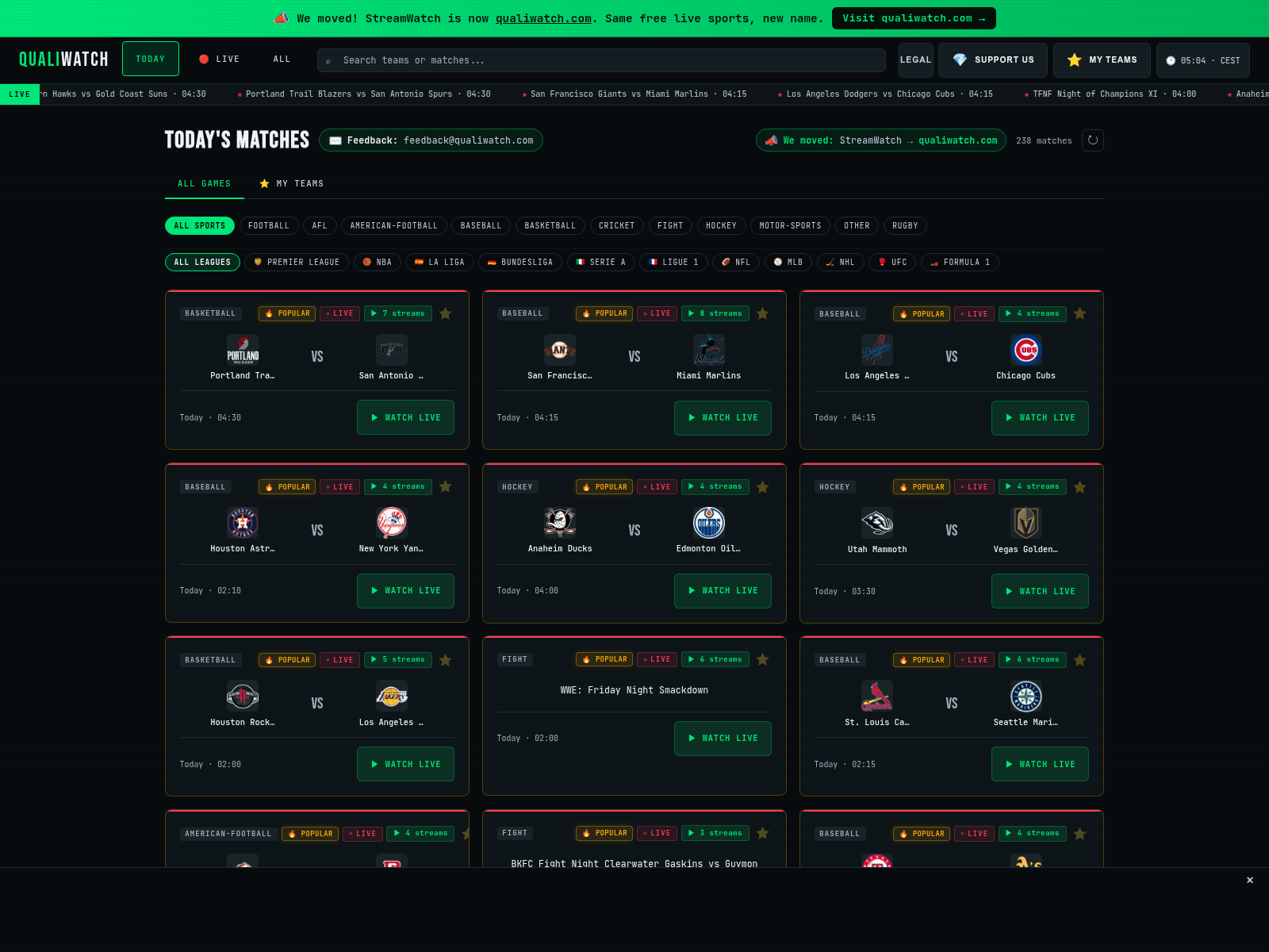 The site displays a page titled “QualiWatch — Free Live Sports Streams & Schedule (Football, NBA, F1)”.