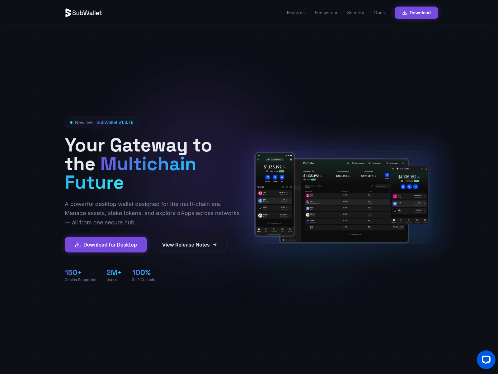 The site displays a page titled “SubWallet — Multichain Crypto Wallet for Desktop | Download v1.3.76”.