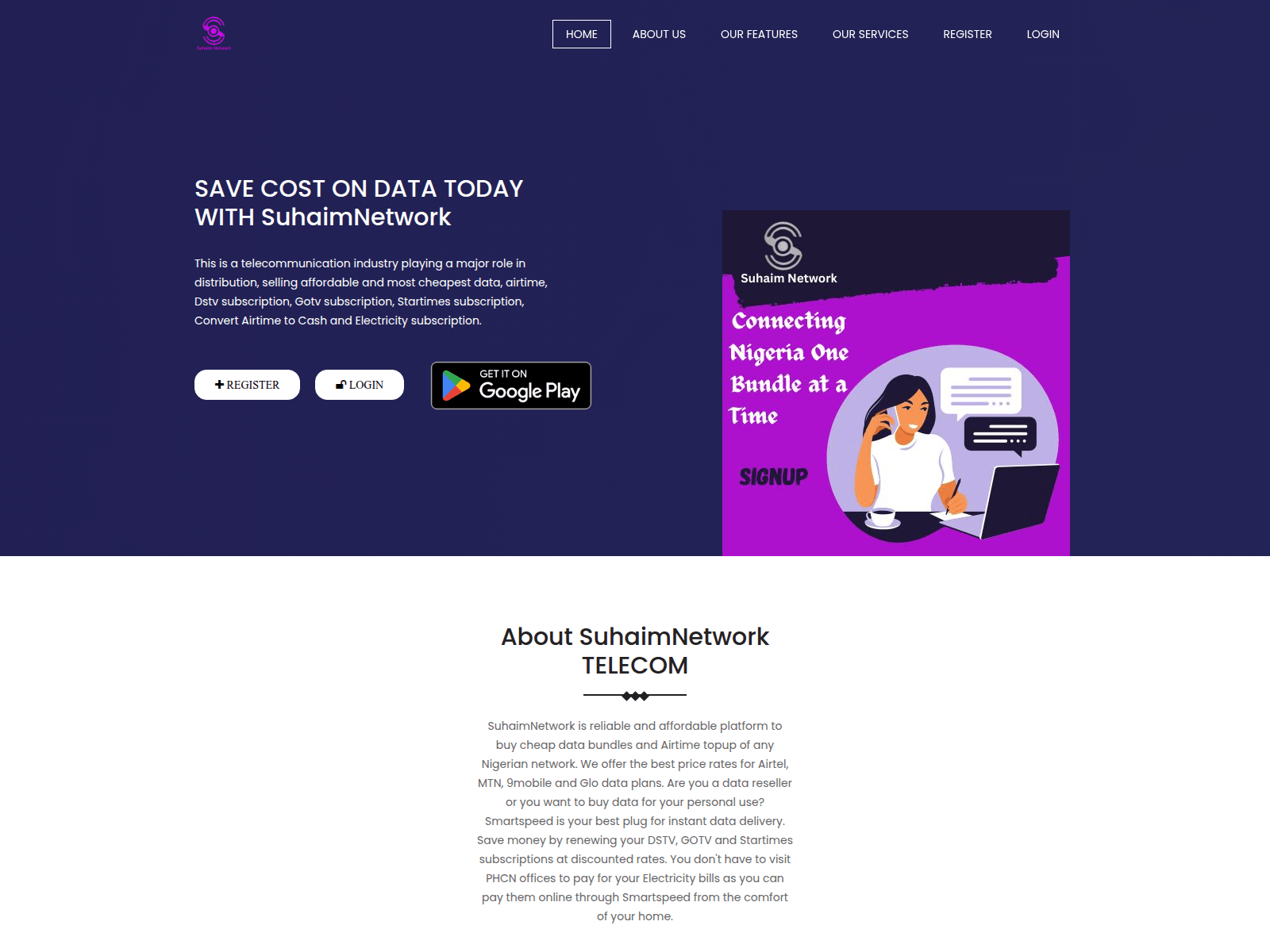 The site displays a page titled “SuhaimNetwork | A technology platform that offers solutions to digital needs at best possible pri...”.
