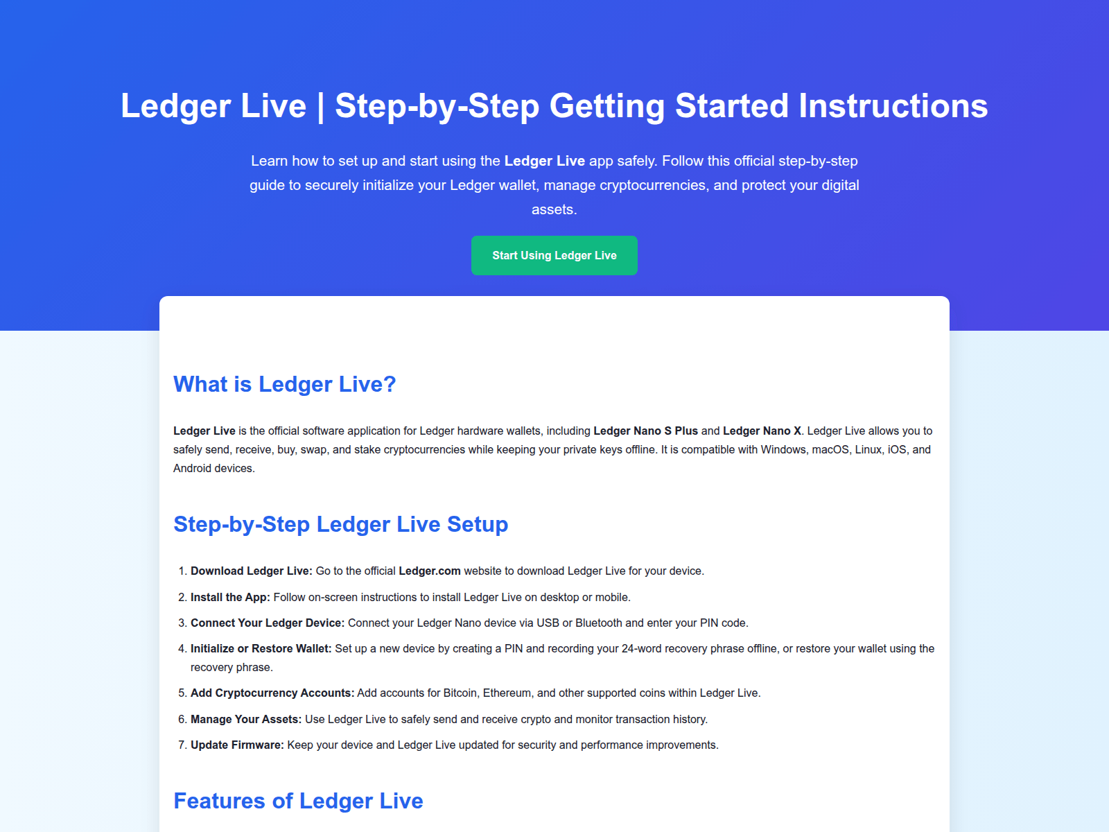 The site displays a page titled “Ledger Live | Step-by-Step Getting Started Instructions”.