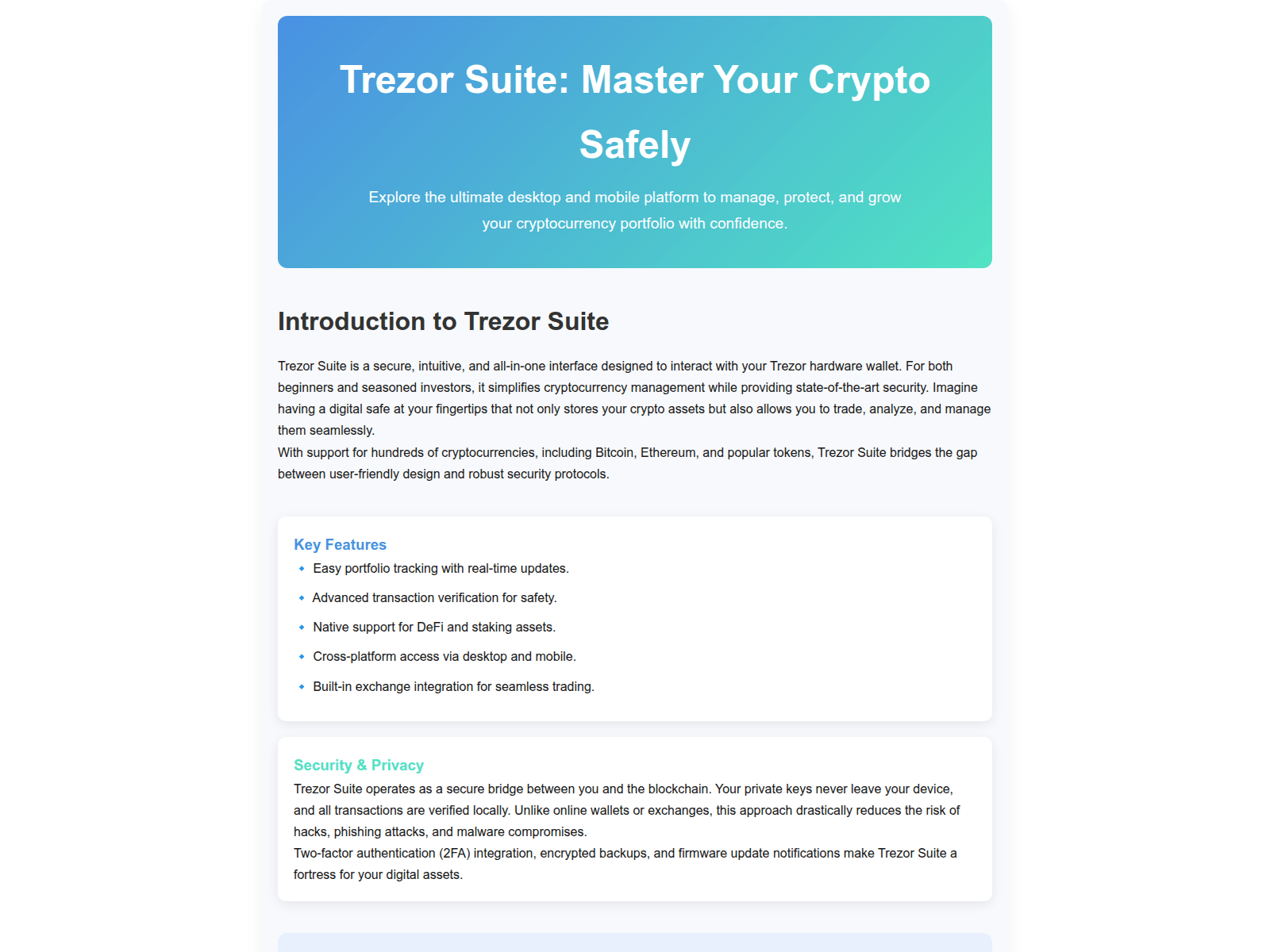 The site displays a page titled “Trezor Suite: Manage Your Crypto with Security”, which may be designed to impersonate Trezor.