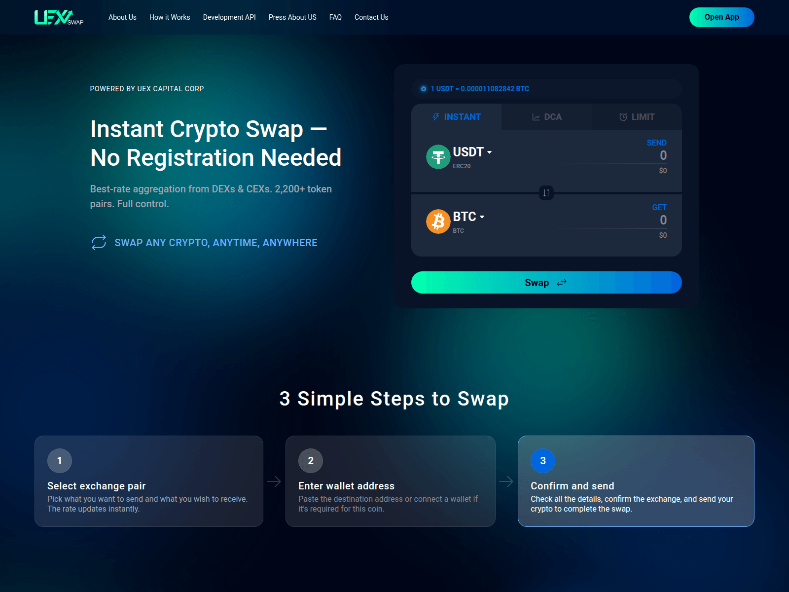 The site displays a page titled “UexSwap | Instant Cryptocurrency Exchange | Best rates”.