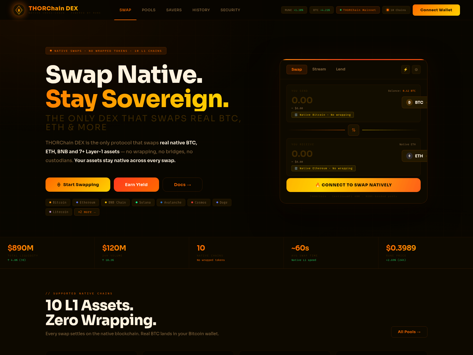 The site displays a page titled “THORChain DEX â Native Cross-Chain Swaps!”.