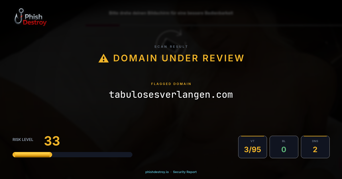 This domain security report for tabulosesverlangen.com is maintained by PhishDestroy's automated threat intelligence pipeline. Our system continuously monitors this domain across 3 security vendors on VirusTotal, 1 public blocklists.