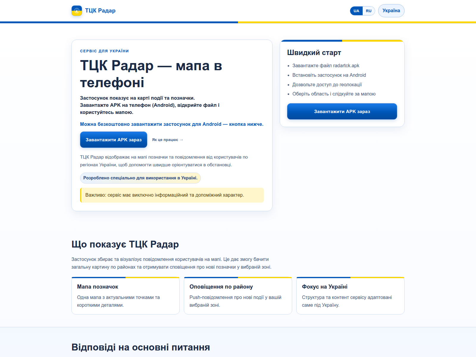 The site displays a page titled “ТЦК Радар - застосунок для України”.