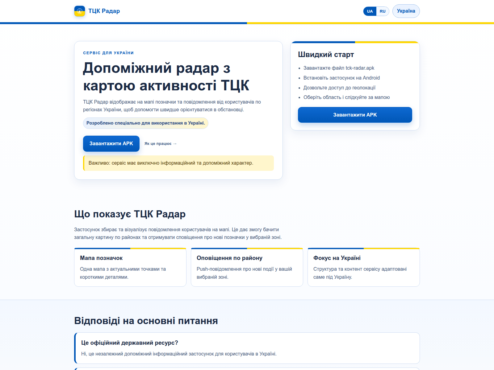 The site displays a page titled “ТЦК Радар - застосунок для України”.