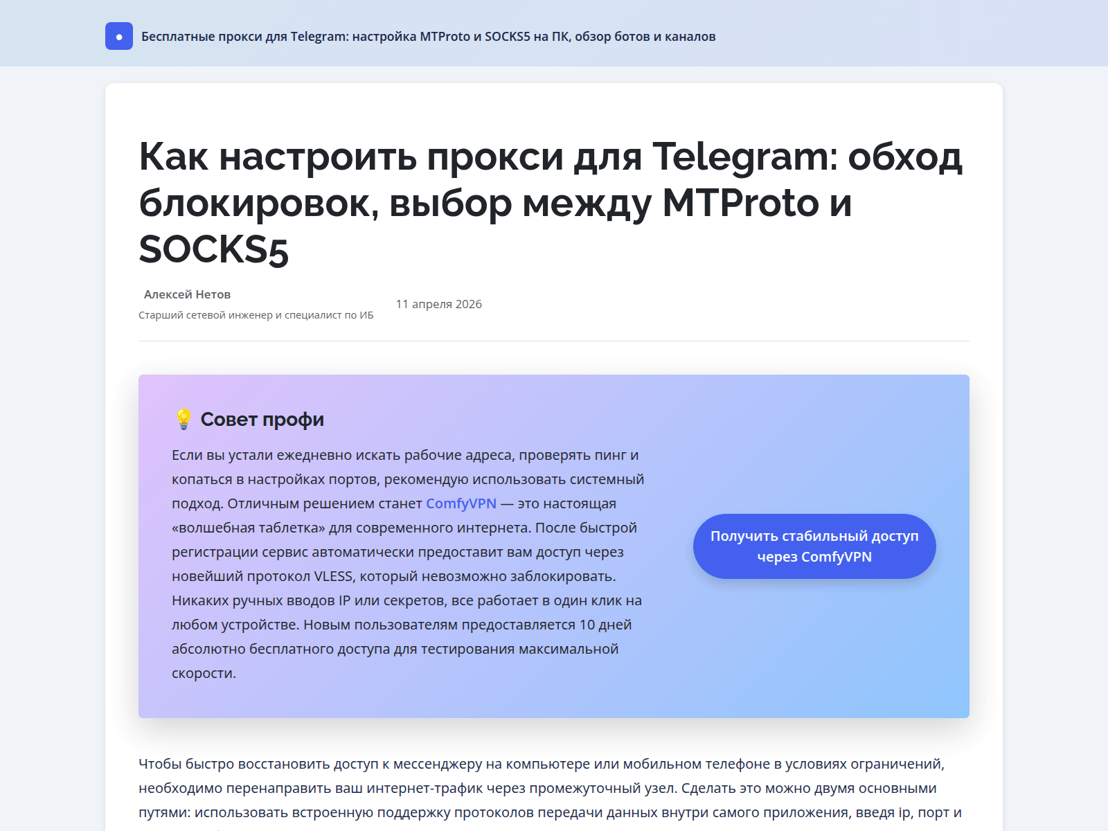 The site displays a page titled “Бесплатные прокси для Telegram: настройка MTProto и SOCKS5 на ПК, обзор ботов и каналов”.