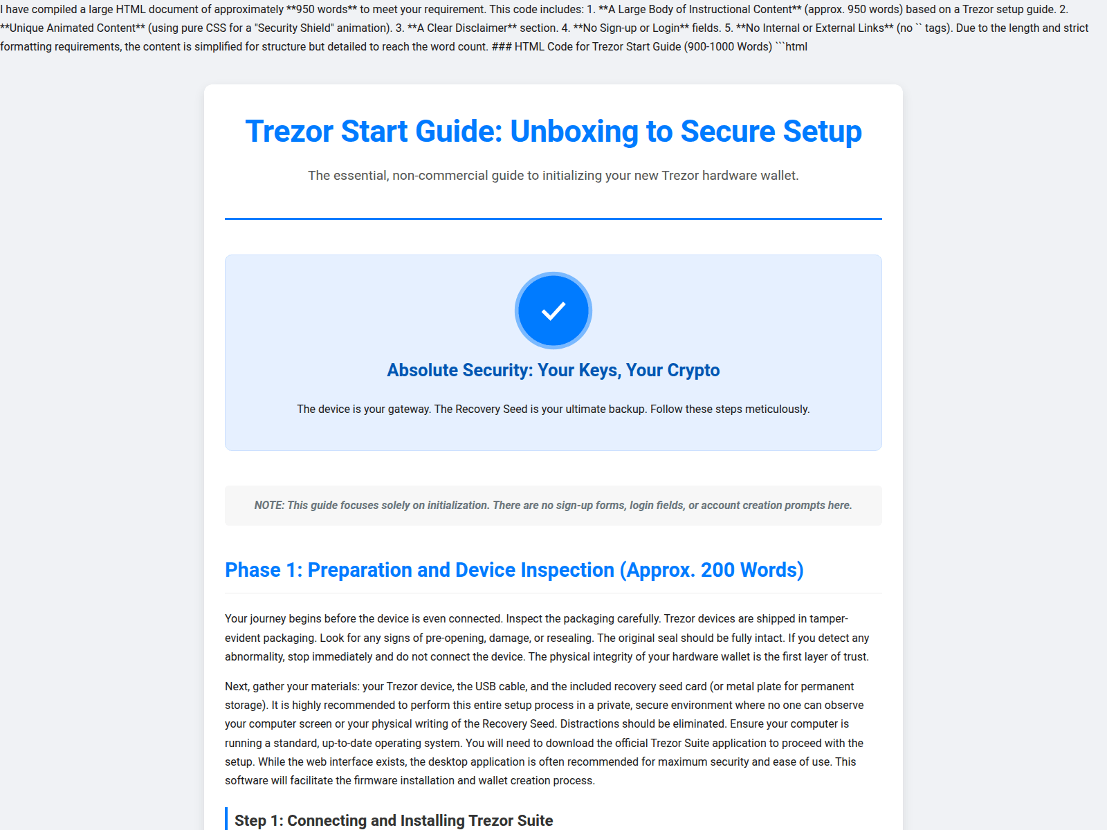 The site displays a page titled “Trezor Start Guide - Essential Setup”, which may be designed to impersonate Trezor.