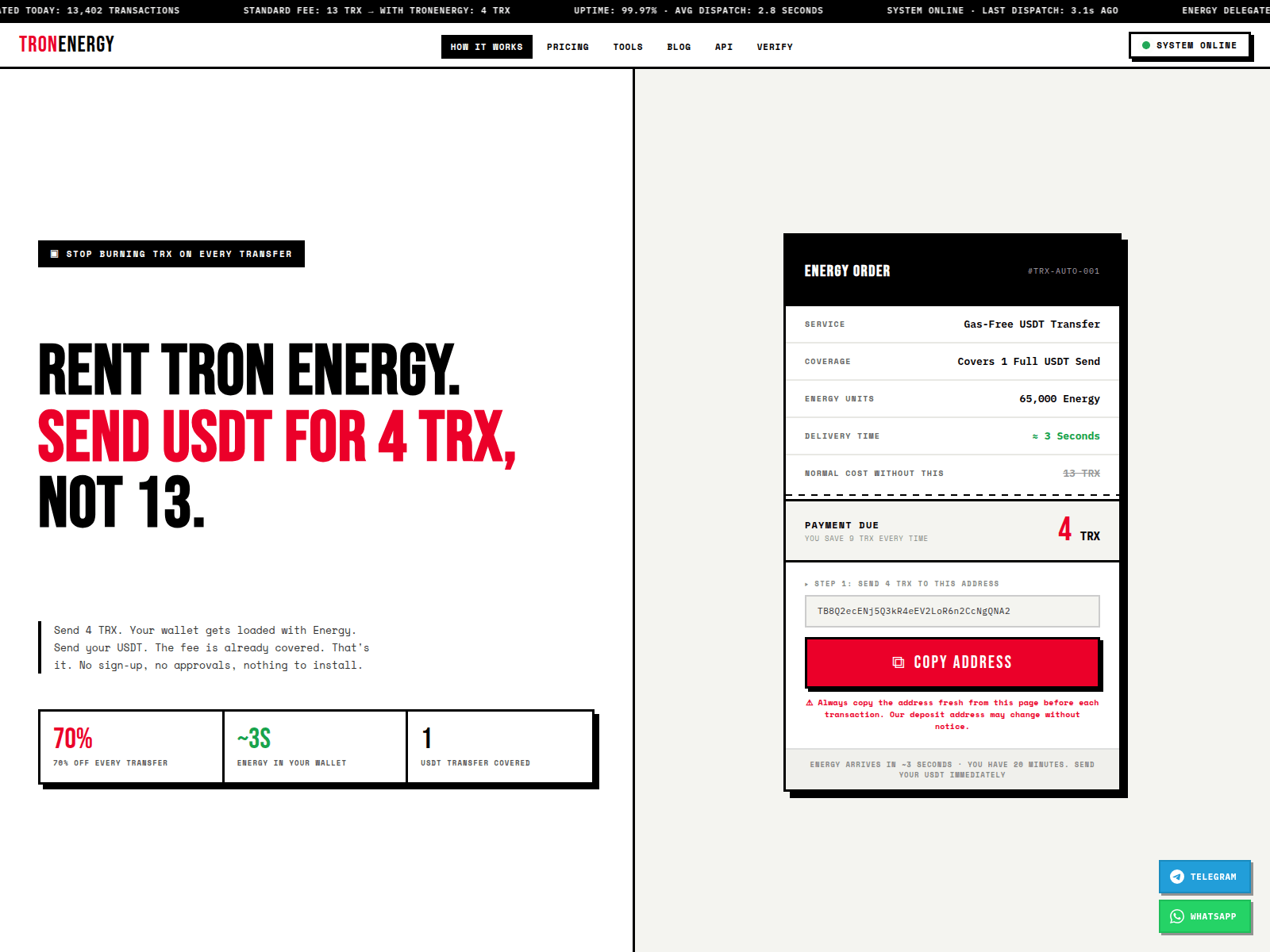 The site displays a page titled “Rent Tron Energy: Send USDT for 4 TRX Instead of 13”.