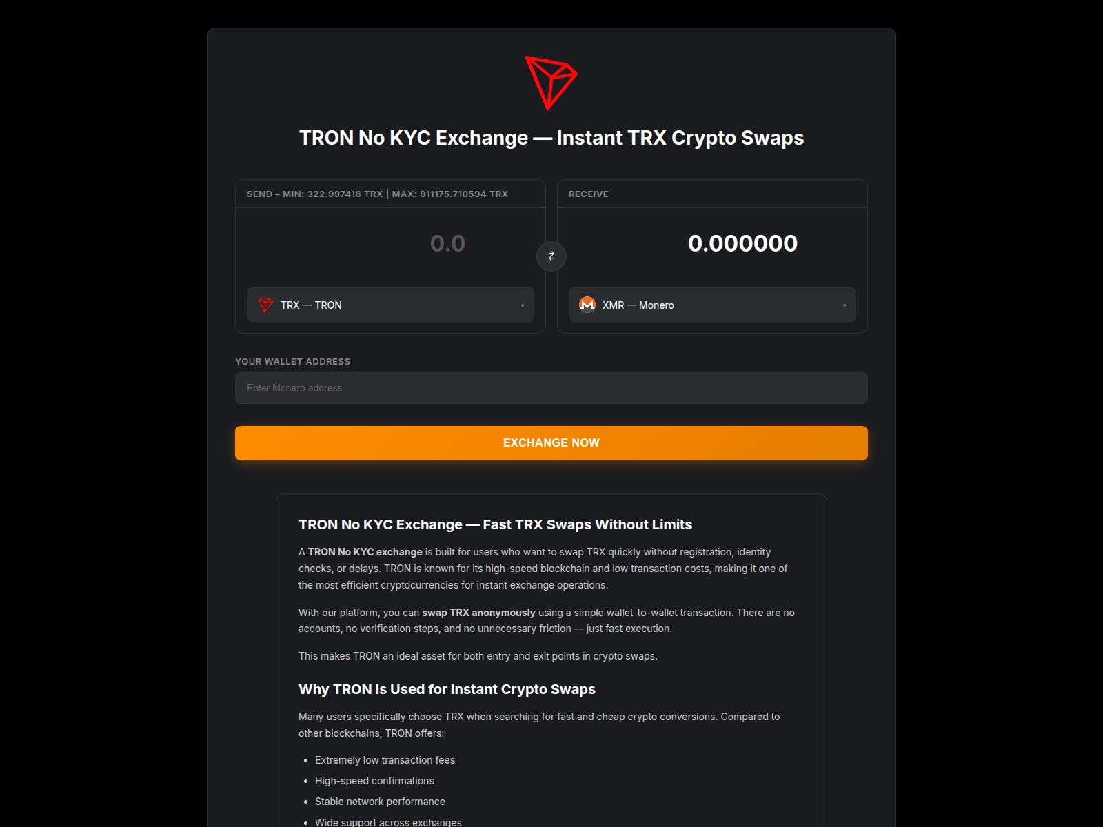 “TRON No KYC Exchange — Instant TRX Swap to BTC, XMR, USDT”