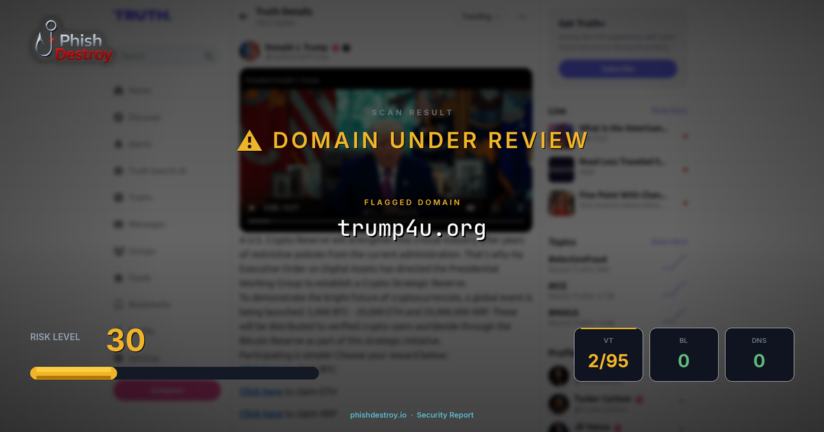 The domain trump4u[.]org has been identified as a cryptocurrency phishing website. This malicious site targets Web3 users by mimicking legitimate crypto platforms to steal wallet credentials and digital assets.