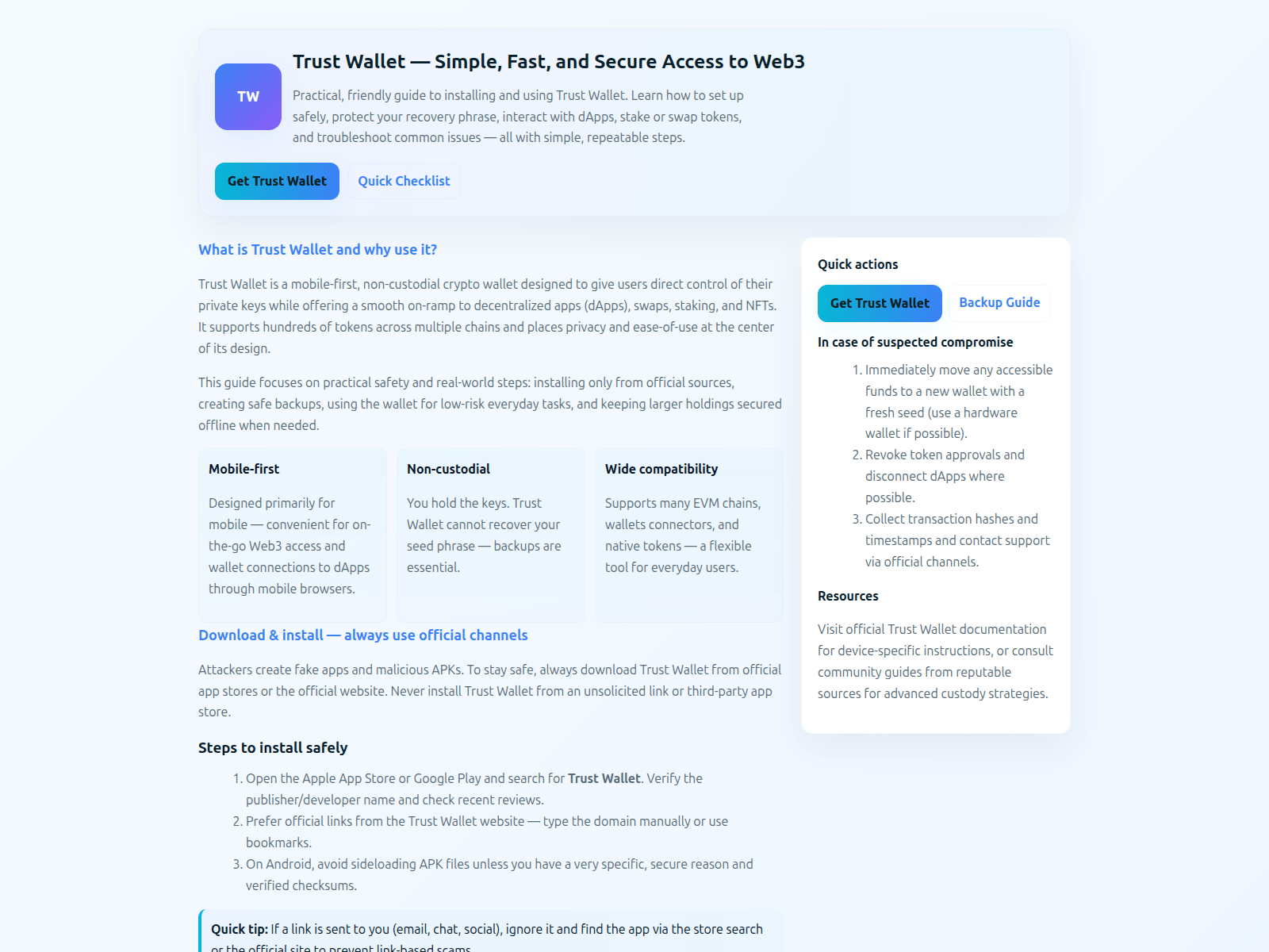 - Use a hardware wallet (Ledger, Trezor). Never store large amounts in browser wallets