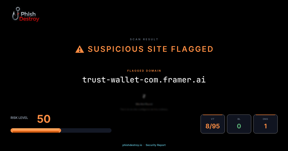 This domain security report for trust-wallet-com.framer.ai is maintained by PhishDestroy's automated threat intelligence pipeline. Our system continuously monitors this domain across 8 security vendors on VirusTotal, 1 public blocklists.