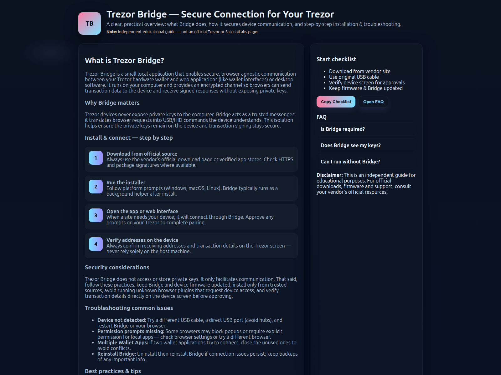 The site displays a page titled “Trezor Bridge — Secure Connection for Your Trezor (Independent Guide)”, which may be designed to impersonate Trezor.