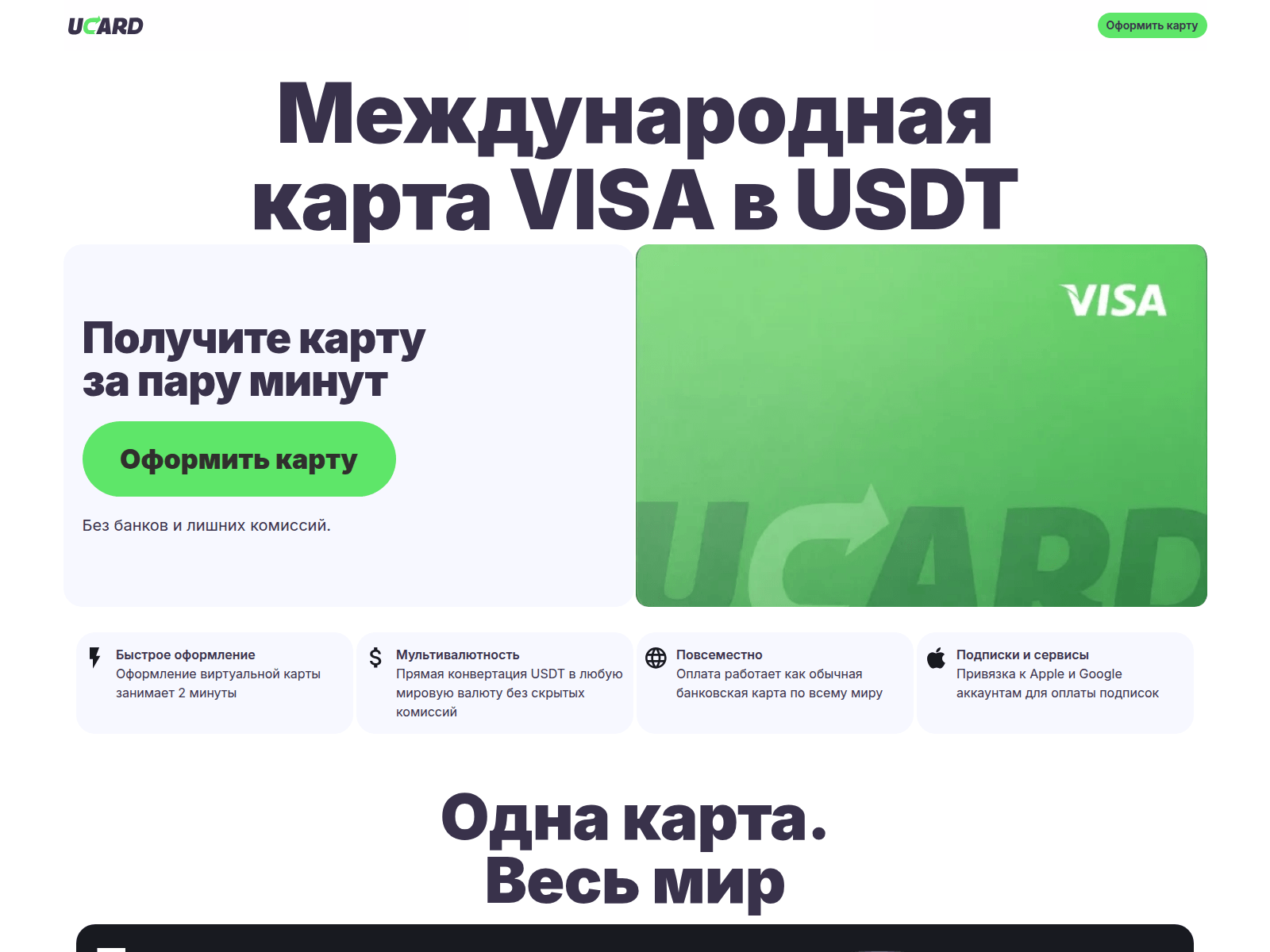The site displays a page titled “UCARD - Криптокарта VISA в USDT”.