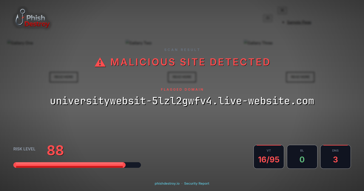 This domain security report for universitywebsit-5lzl2gwfv4.live-website.com is maintained by PhishDestroy's automated threat intelligence pipeline. Our system continuously monitors this domain across 16 security vendors on VirusTotal, 1 public blocklists.