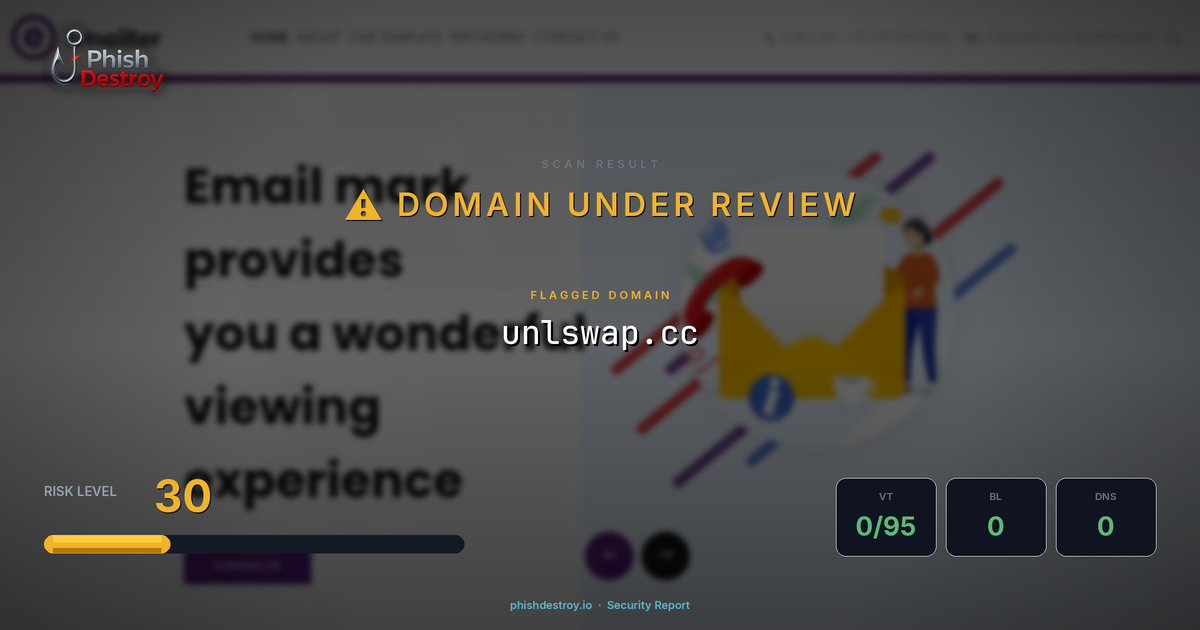 This domain security report for unlswap.cc is maintained by PhishDestroy's automated threat intelligence pipeline. Our system continuously monitors this domain across 95 security vendors on VirusTotal, 1 public blocklists.