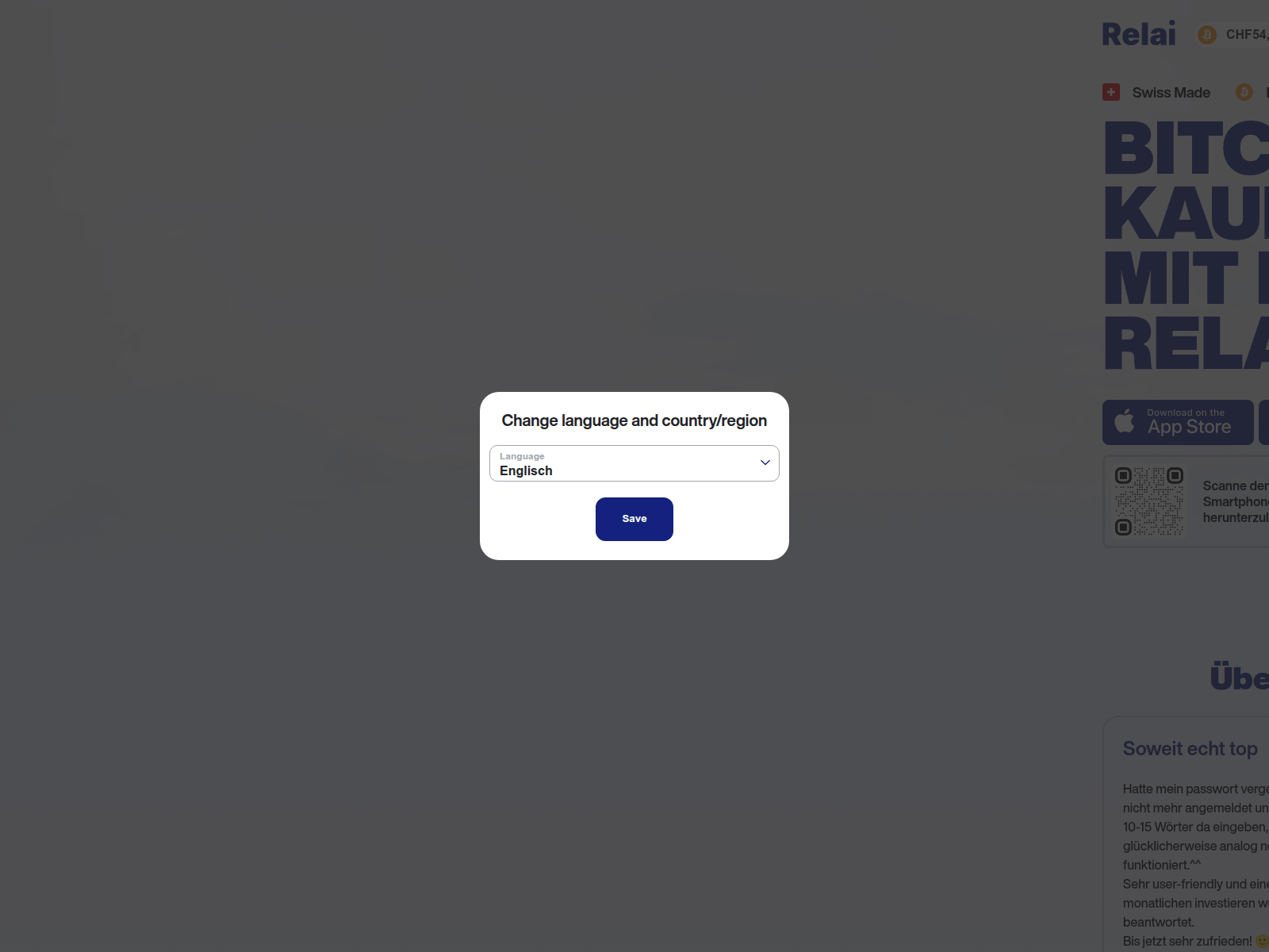 The site displays a page titled “Bitcoin kaufen (BTC) via Überweisung/Kreditkarte - Relai App Schweiz”, which may be designed to impersonate Bitcoin.