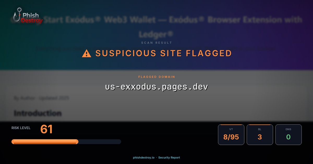This domain security report for us-exxodus.pages.dev is maintained by PhishDestroy's automated threat intelligence pipeline. Our system continuously monitors this domain across 8 security vendors on VirusTotal, 3 public blocklists.